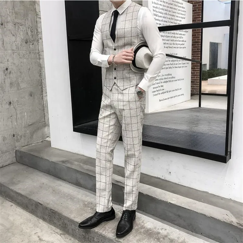 Best Chance for (Blazer+vest+pants) 2019 new fashion plaid men's suit beige grey casual groom wedding dress men ban